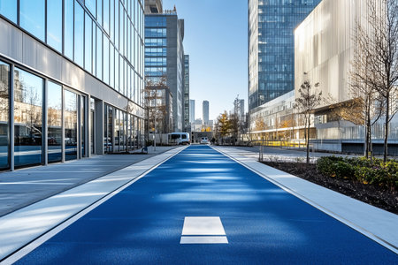 Modern urban cityscape with blue running track and skyscrapers at sunrise
