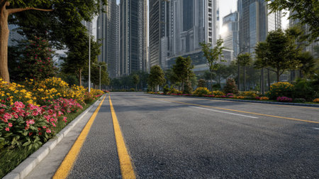 An artistic perspective of a bicycle lane in an urban setting, with colorful bike markings on the road, emphasizing eco-friendly transportation options.