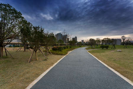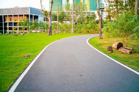 Empty asphalt walking running park road in city sunset green grass nature outdoor