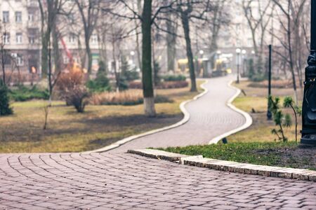 sidewalk alley in autumn park on a rainy day, fall autumn background