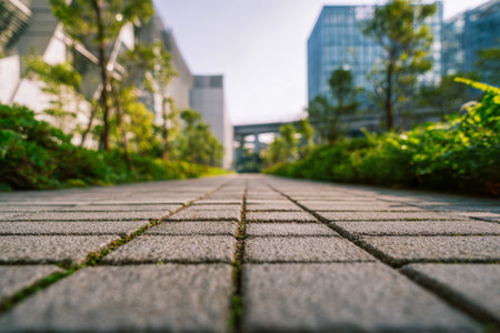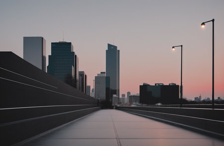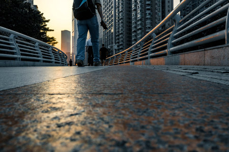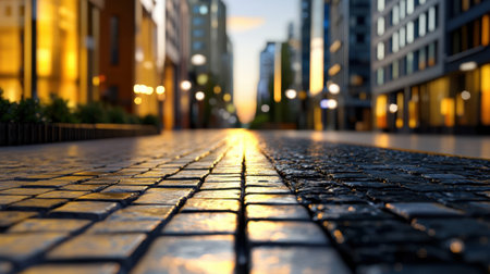 From a low perspective, a brick-paved path with railings leads to a city skyline, bathed in the warm, glowing light of a beautiful sunset, creating a serene urban scene.