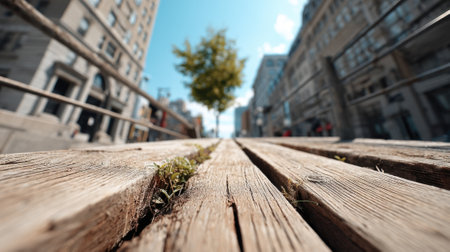 A wooden walkway stretches into the distance, guiding the eye toward a solitary tree. Surrounding buildings rise on either side, illuminated by bright sunlight.