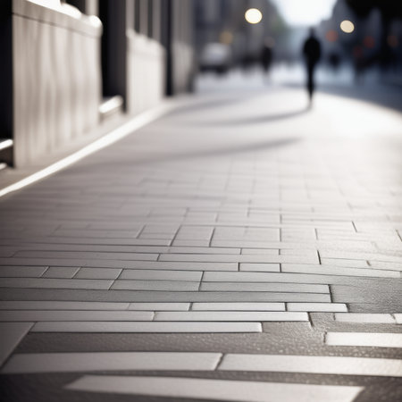 City street at golden hour with soft shadows, clean perspective, people in distance