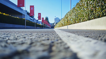 Low angle view of an asphalt road marked with a white line, flanked by green hedges and red banners under a clear, bright sky.
