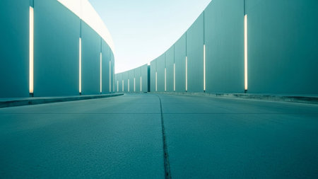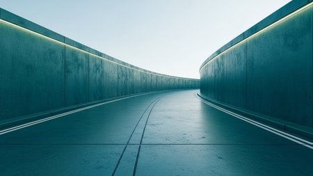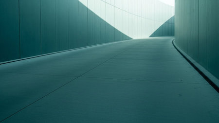 A modern architectural pathway curves into the distance, bathed in a cool teal light. Dramatic shadows cast by unseen structures create a striking contrast across the smooth concrete surfaces. The clean lines and minimalist evoke a sense of calm and futuristic elegance. captures the interplay of light and form within a contemporary architectural space, highlighting its geometric beauty and serene atmosphere. The perspective draws the viewer into the scene, emphasizing the vastness and clean