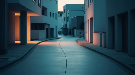 A modern, minimalist street scene unfolds under the soft glow of dusk. Warm orange light spills from the windows and architectural of clean-lined buildings, casting long shadows across the smooth, grey concrete pathway. The street curves gently into the distance, creating a sense of depth and perspective. The overall atmosphere is quiet, serene, and uncluttered, highlighting the geometric simplicity of the urban environment. The blue hour sky provides a cool contrast to the warm illumination.