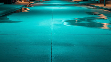 A wet asphalt street is illuminated by vibrant turquoise lights, casting colorful reflections on the surface. Puddles of water create abstract patterns, mirroring the glowing lights and the dark urban environment. The scene is moody and atmospheric, with a sense of solitude and mystery. The geometric lines of the pavement and the reflections create a visually striking and abstract composition.