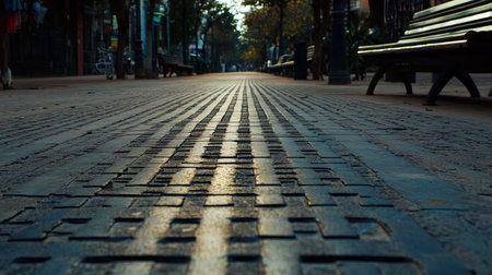 Golden Hour Sunlight on Empty Cobblestone Street with Train Tracks and Urban Graffiti Art, 2026