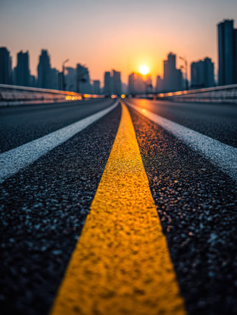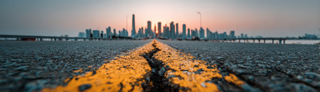 Asphalt road features a striking yellow line leading to a stunning city skyline at sunset, highlighting urban textures and the serene ambiance of the scene
