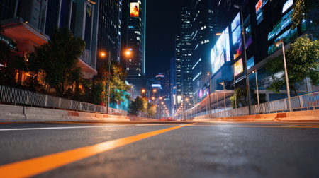 A captivating view of an empty night street, showcasing colorful neon lights illuminating modern skyscrapers in a vibrant urban city.