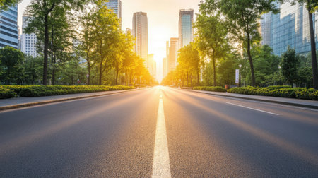 A stunning urban street basked in the warm glow of sunrise, bordered by vibrant green trees and modern skyscrapers, capturing the essence of city life and tranquility.