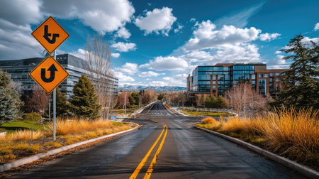 A captivating urban scene showcasing a wide roadway with turn signs, flanked by contemporary buildings and framed by a vivid blue sky with clouds.