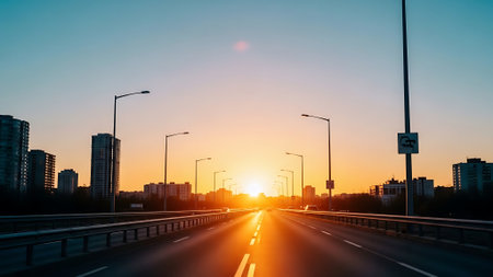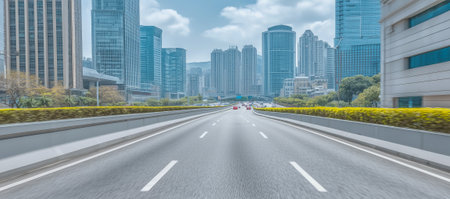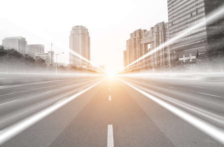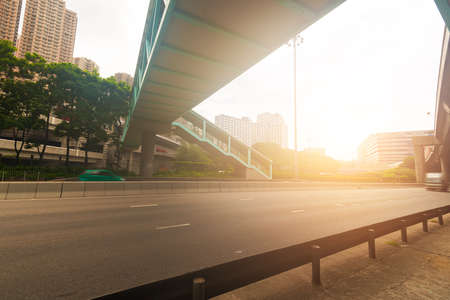 Perspective straight empty highway road with modern cityscape. Morning scene view.