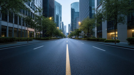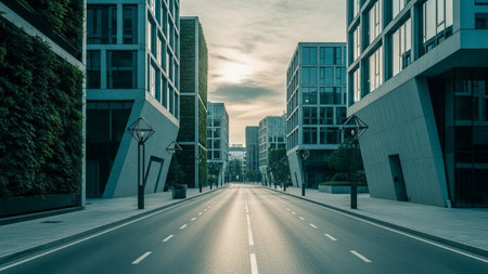 A clean, empty road stretches between modern office buildings, emphasizing urban design and calm in the city.