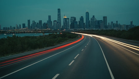 Captivating nighttime view of a busy highway illuminated by vibrant light trails, showcasing modern skyscrapers and the dynamic energy of urban life.