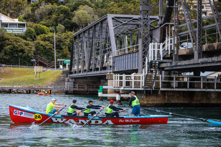 Synchronized rowers in competitive regatta with perfect water splashes in a harmonious scene
