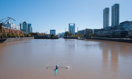 Buenos Aires, Argentina - April 14 2017: Life in Puerto Madero, the river and its buildings in Buenos Aires City.