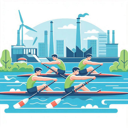 A thrilling scene of rowers showcasing athleticism and teamwork during a competition on a sunny day. The city skyline provides a stunning backdrop.