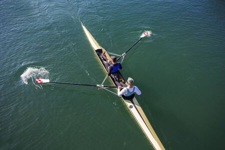 Two men row in sync on a calm river, showing their strength and skill during morning training.