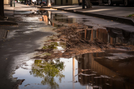 puddle of murky water on the sidewalk, with a stream of sewage flowing into it, created with generative ai