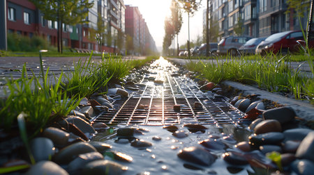 abstract shot of overflowing gutter reflecting surrounding nature, created with generative ai