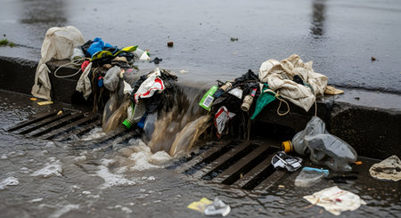 A storm drain on a wet street is clogged with plastic bottles, bags, and other garbage, with rainwater flowing over the debris. The image starkly illustrates the problems of pollution, improper waste disposal, and their environmental impact, which can lead to flooding.