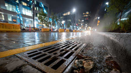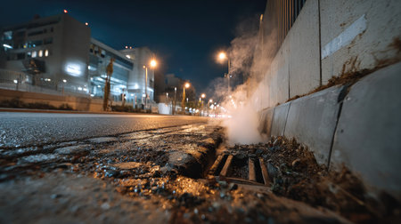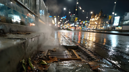 A captivating urban night scene showing wet streets with a drainage grate and steam rising from the pavement, highlighting modern city life and infrastructure.