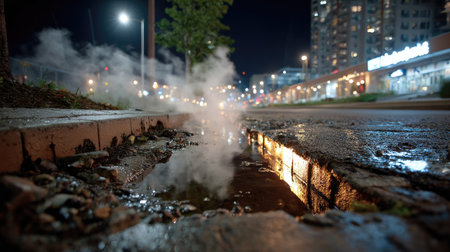 A captivating urban night scene showcasing steam rising from a street drain beside an empty road, accentuated by distant city lights illuminating the surroundings.