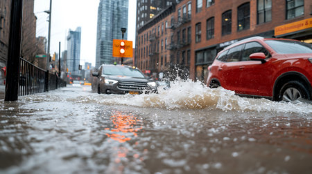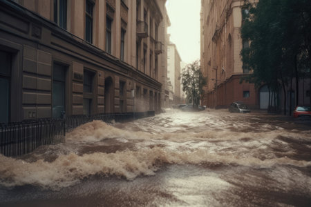 Flooding in city street. Street after hurricane and heavy rain. Property damage by high water. Created with Generative AI