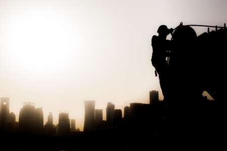 Doha,Qatar - December 11,2017. Construction workers preparing a crane for work in the background skyscrapers in Doha.