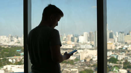 Businessman standing using smart phone on open roof top balcony watching city night view.Business with ambition and vision concept.