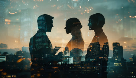 Double exposure of business professionals collaborating in office with cityscape for team success