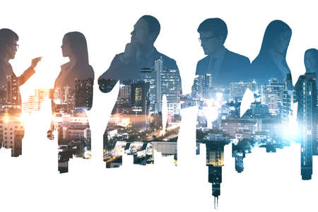 Wide image of businesspeople silhouettes standing on abstract night city background. Teamwork and communication concept. Double exposure