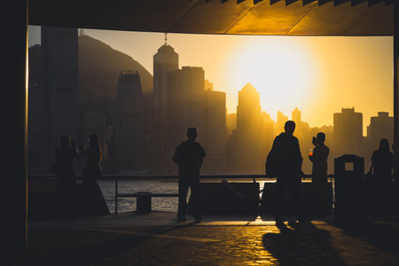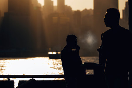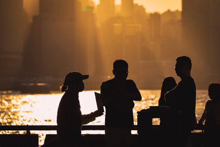 Silhouetted figures stand along a waterfront promenade as a warm sunset Nov 16 2025