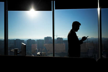 Silhouette of businessmen standing in a modern corporation and agreeing on business projects. Selective Focus