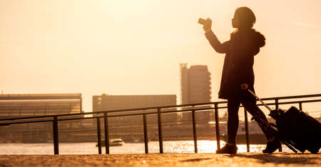 asian woman hand hold camera traveller with background of house architecture and river,asian photograper backpacker travel alone vacation concept sunset momwnt