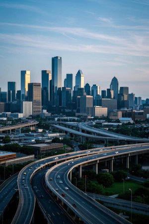 A bustling city skyline backdrop with tall skyscrapers and a vibrant sunset, creating an energetic and dynamic scene.
