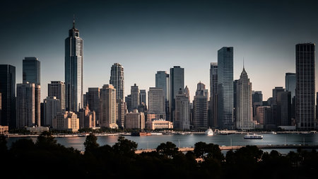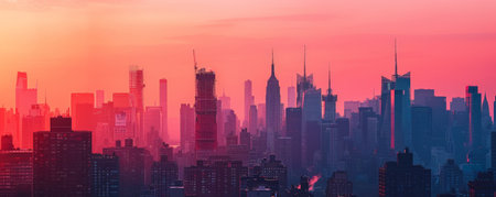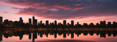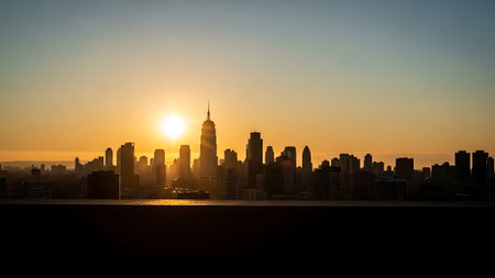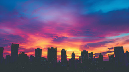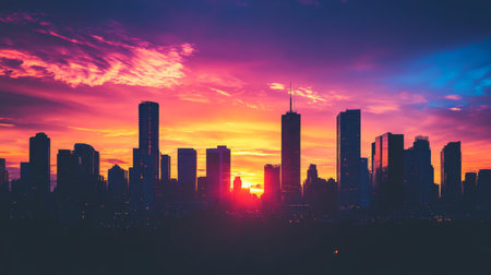 A breathtaking sunset view of a skyline silhouette, with skyscrapers standing tall against a colorful sky, evoking a sense of tranquility and reflection