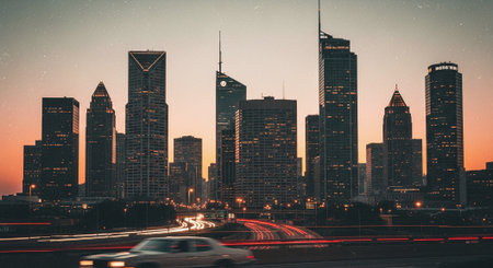 Vibrant Cityscape Illumination, Night Photography Showing Skyscrapers and Long Exposure Light Trails