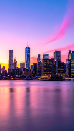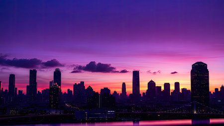 A urban panorama unfolds as the sun dips below the horizon, casting a vibrant purple and magenta glow across a modern cityscape. Towering skyscrapers pierce the dusky sky, their windows illuminated, creating a spectacle. The city lights are mirrored in the calm waters of a wide river flowing through the foreground, doubling the visual impact of the electric urban scene. Wispy clouds drift across the sky, adding a touch of drama to the atmospheric twilight.