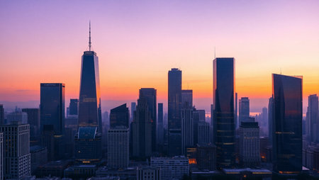 Panoramic view of a city skyline at twilight with a beautiful purple sunset and colorful sky in the background, and bright lights in the skyscrapers.