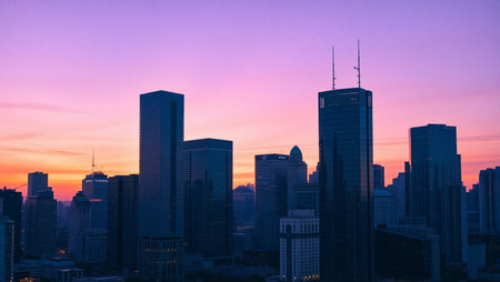 A stunning urban skyline at dusk showcasing modern high-rise buildings illuminated in vibrant colors against a purple sky, creating a captivating atmosphere.