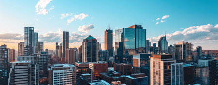 A panoramic view of a city skyline during sunset, featuring tall skyscrapers and a prominent tower, with a warm golden light illuminating the buildings