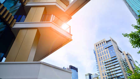 Bottom view of modern skyscrapers in business district against blue sky. Looking up at business buildings in downtown.
