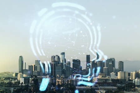 Abstract virtual artificial Intelligence interface with human head hologram on Los Angeles skyline background. Multiexposure