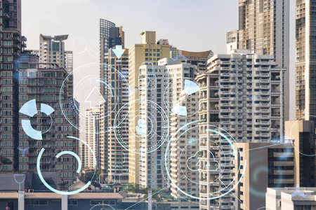 Technology hologram over panorama city view of Bangkok. The largest tech hub in Southeast Asia. The concept of developing coding and high-tech science. Double exposure.