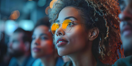 A man with glasses and a black hat is looking up at the sky. The sky is lit up with neon colors, creating a vibrant and energetic atmosphere