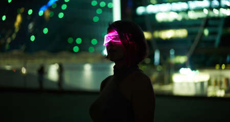 Cyberpunk style portrait of beautiful young woman in futuristic costume.