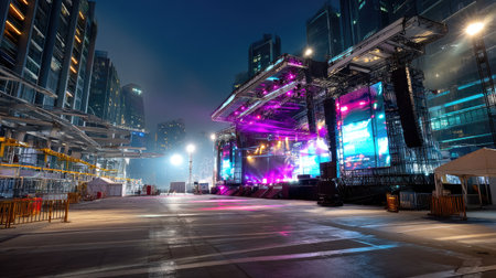 A stunning view of a concert stage illuminated with vibrant lights, set against a modern urban skyline at night, perfect for promoting music events.
