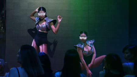 Portrait of serious gen Z people looking camera with serious face. Night club lifestyle